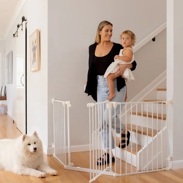 Families enjoy gathering in the kitchen to eat and share stories, but having a baby complicates things, as the biggest danger in this space is access to fridge, draws and cabinets.